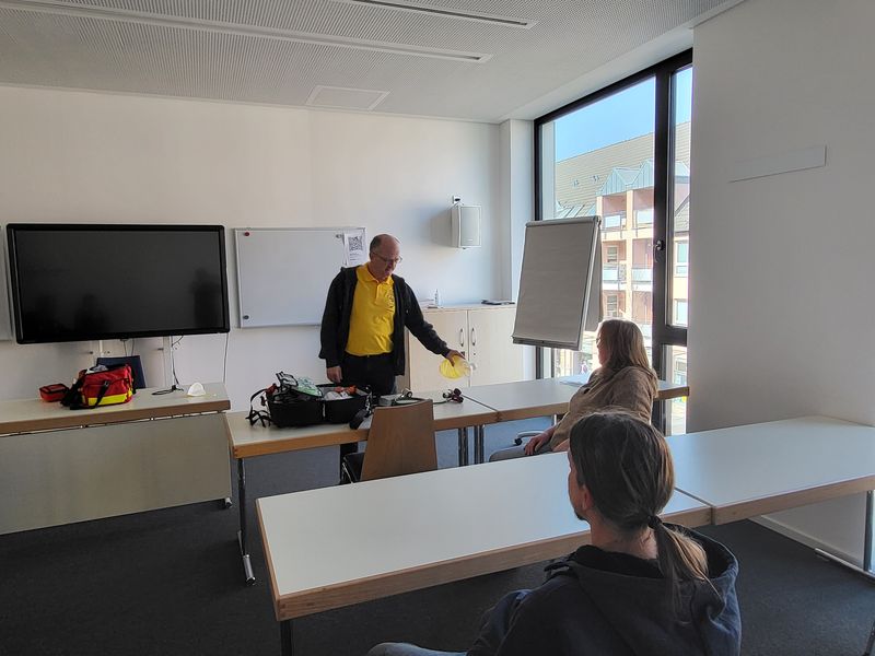 Die Gruppen hatten für jede Station jeweils ca. 25 min. Zeit. Bei Station 2 bis 4 passte der zeitliche Rahmen gut. Bei Station 1, wo Frank mit unserer Flotte Flosse-Übungspuppe „Flotte Lotte“ HLW und AED anbot, war das definitiv zu knapp. Dort wurde geübt und geübt und geübt …. Die Flotte Lotte bekam viele Herzdruckmassagen und auch der Übungs- AED kam immer wieder zum Einsatz. Diese Station hat immer überzogen, (für mich als Organisatorin heißt das, dort beim nächsten Mal mehr Zeit einzuplanen) aber gerade dieses praktische Üben kam bei den Teilnehmern sehr gut an.