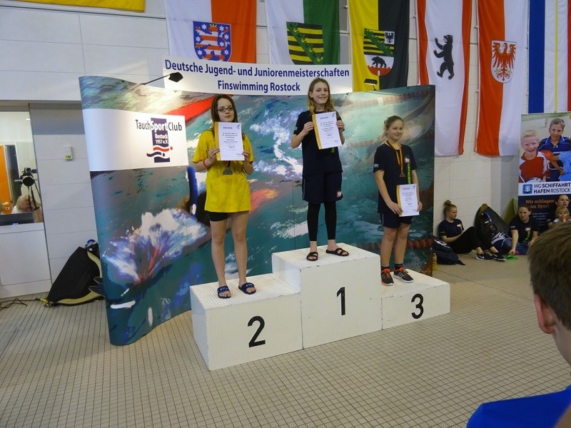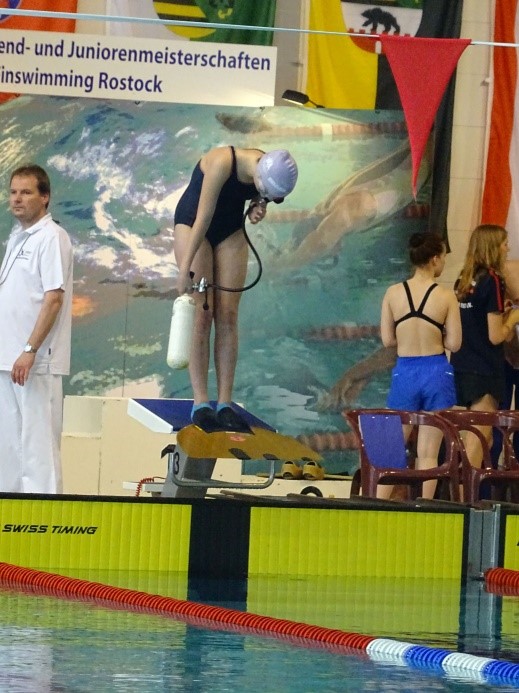 Am nächsten Tag begannen dann auch schon die nationalen Titelkämpfe. Nach der Kontrolle der Ausrüstung, der Eröffnung mit Nationalhymne und dem Einmarsch der Wettkampfrichter ging der Wettkampf für Julia los. Dabei fiel uns auf, dass die Veranstalter vergessen hatten unsere rheinland-pfälzische Fahne neben den anderen Fahnen aufzuhängen. Das hinderte sie aber nicht daran, ihre persönliche Bestzeit auf 1500m FS zu pulverisieren und um knapp 3 Minuten auf 17:28,94 zu verbessern. Diese herausragende Leistung wurde mit dem Vizemeistertitel belohnt. Die 400m ST startete Julia in Rostock zum ersten Mal und verpasste mit einer super Zeit von 05:04,66 die Medaillenränge als Vierte nur um sieben Hundertstel.