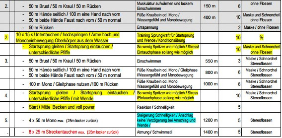 So gerüstet und motiviert, habe ich für dieses D-Kader-Training einen ambitionierten Trainingsplan für ca. 4 Stunden Wasserzeit erstellt.