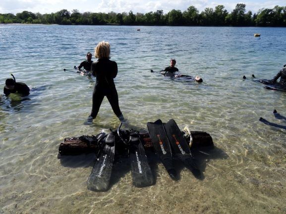 Programmgemäß wurde nach der Vorstellungsrunde die Theorie zum Apnoe-Tauchen vorgestellt und trotz Einhaltung der Abstandsregeln in lebhafter Diskussion vertieft. Die Teilnehmer hatten viele Fragen, die ausführlich beantwortet wurden. Besonders die Bedeutung der Sicherung durch den Partner (Buddy) und die Seile an den Bojen wurde allen deutlich.